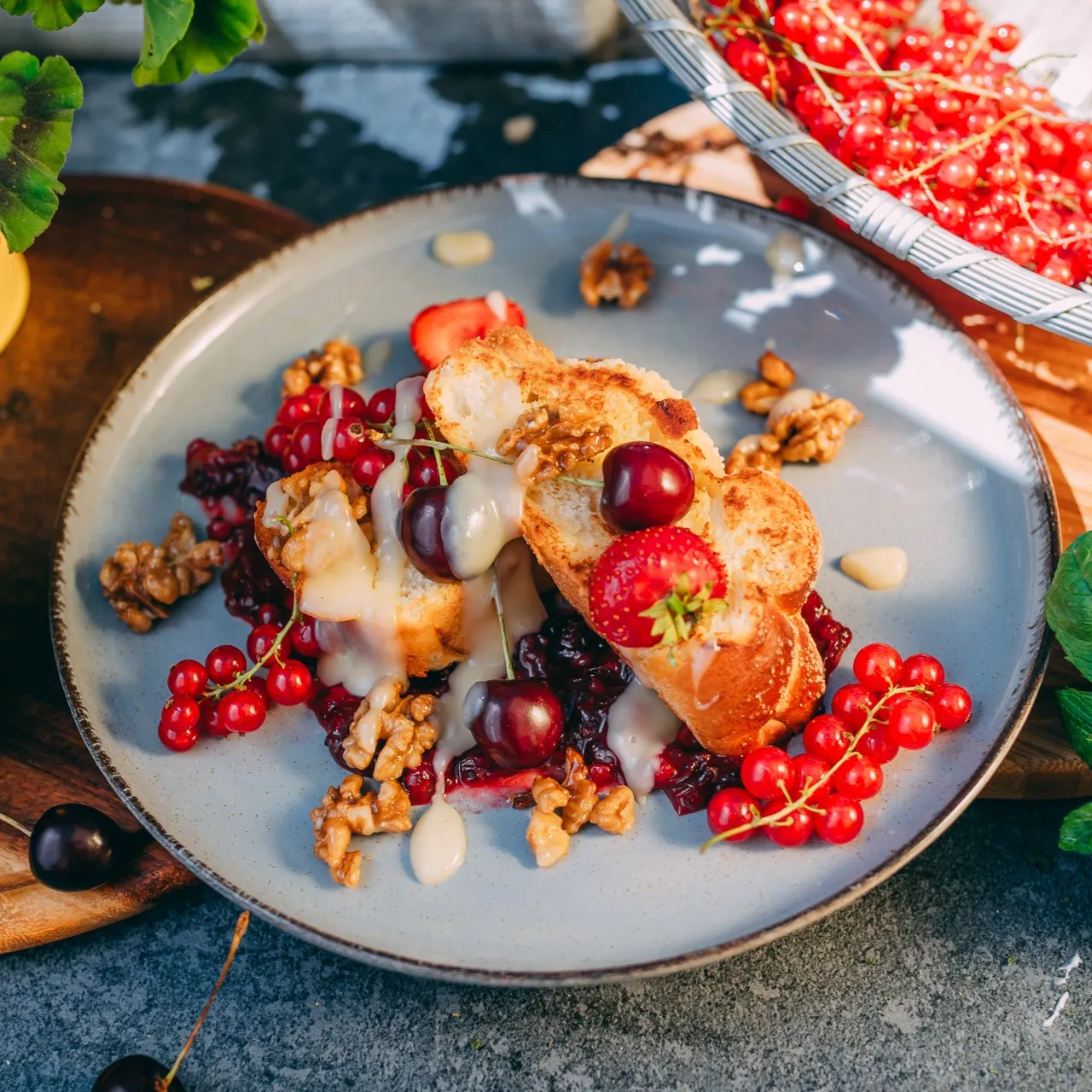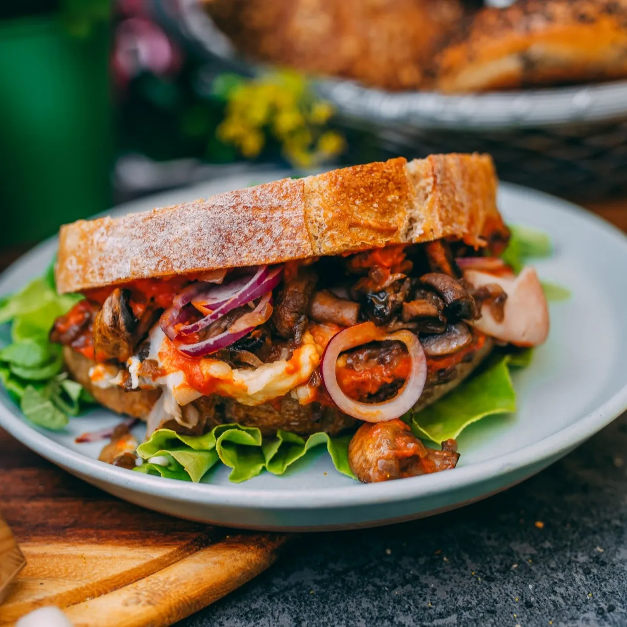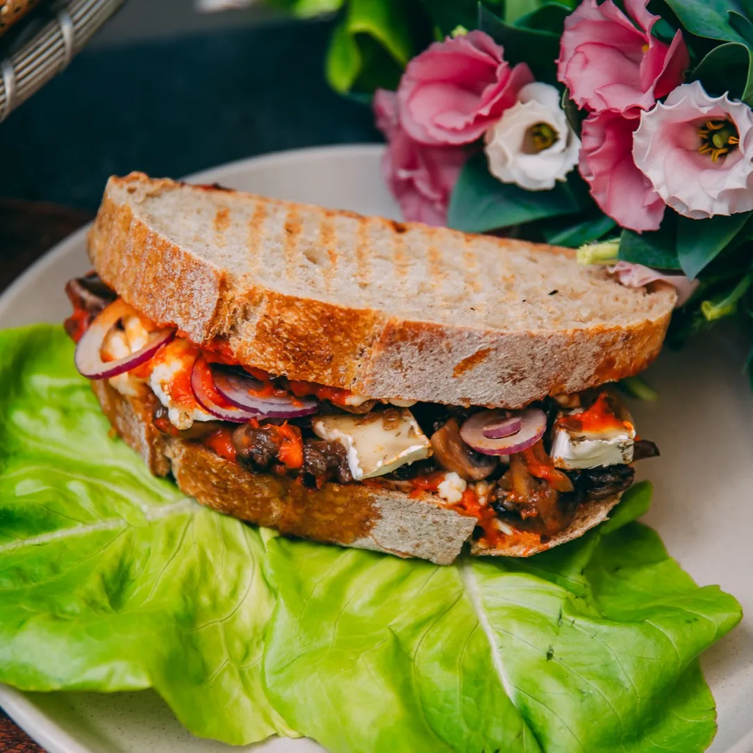 ser camembert / duszone pieczarki z cebulką / pasta z pieczonej papryki / mozzarella / cebula czerwona